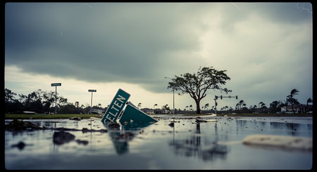 A yellow road sign stands in middle of flooded road, reflecting in water under moody sky. scene captures impact of heavy rain and rising water levels