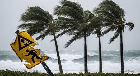 Warning sign with text us ore and palm trees battling extreme weather. Heavy storm and strong wind damaging tropical plants during hurricane impact.