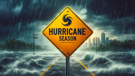 A yellow diamond warning sign reads HURRICANE SEASON against a dramatic stormy sky with lightning.