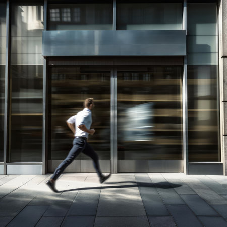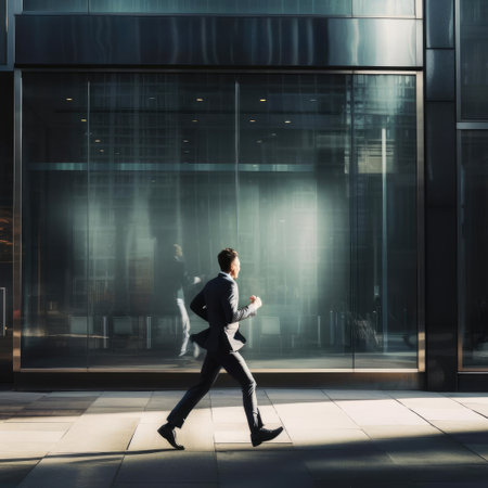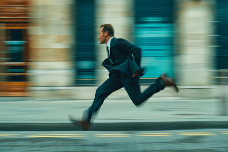A focused businessman dressed in a stylish suit runs energetically through an urban setting, capturing the essence of ambition and speed. This image represents the fast-paced nature of modern life and career advancement.
