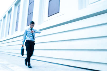 Motion blue Young Asian businessman running on staircase go office hurry work time.