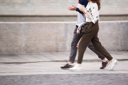 a guy and a girl are walking around the summer city, walking fast and in step