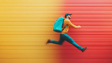 Stylish man running against colorful motion blur background fast delivery excited energy