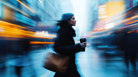 A focused image of a woman walking briskly with coffee and a bag, set against a blurred cityscape for a dynamic, vibrant scene