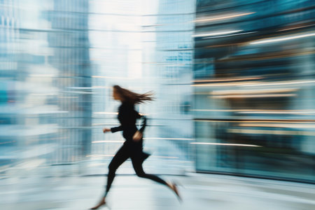 A businesswoman runs through a modern office building, her form blurred by the speed of her movement.
