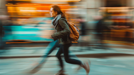 A woman in a blazer and leggings runs through a city, her movement creating a blur effect against the background.