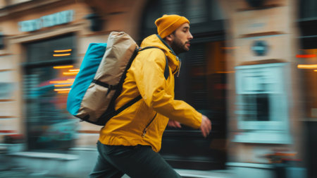 young man in yellow raincoat with backpack walking on city street, motion blur