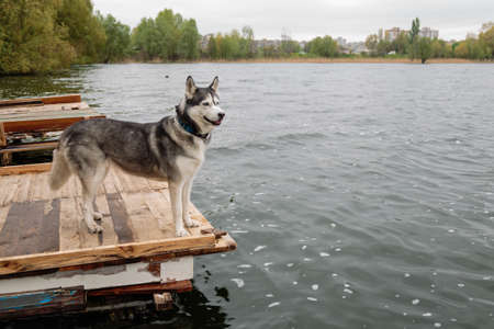Portrait of a close-up dog Siberian Husky. River landscape.