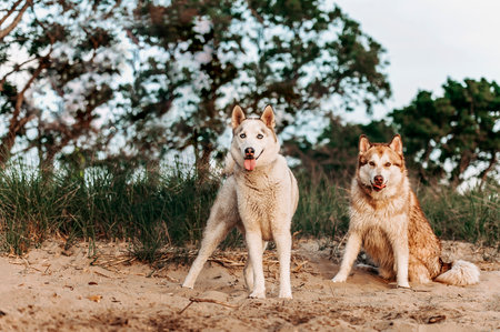 Three beautiful siberian husky dogs sitting on the sand at sunset.