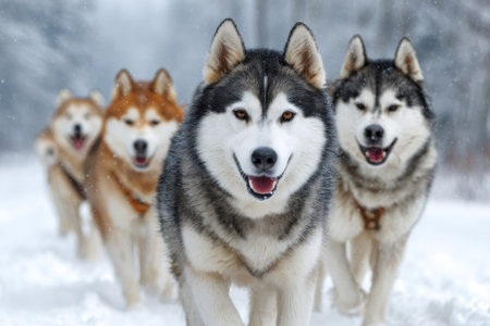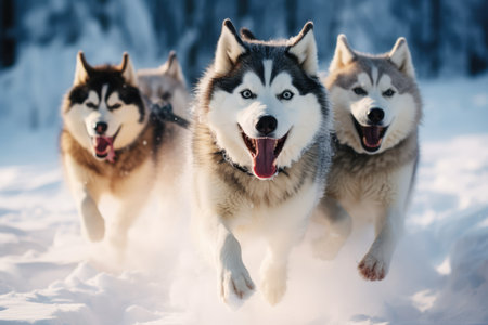 Husky sled dogs enthusiastically pull a sled through the snowy wilderness during winter, showcasing their strength and teamwork