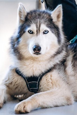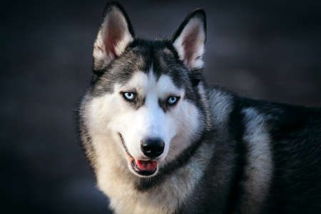 Portrait of a beautiful Siberian Husky dog with blue eyes.