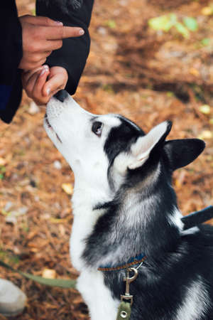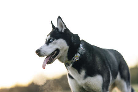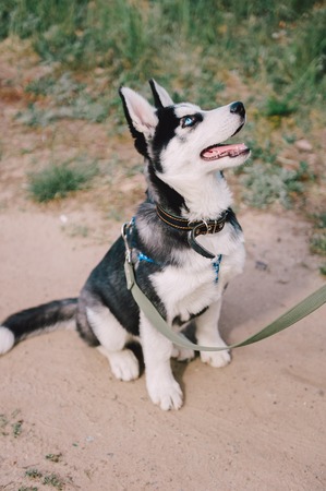 Cute siberian husky puppy dog with blue eyes play outdoors at sunny summer weather