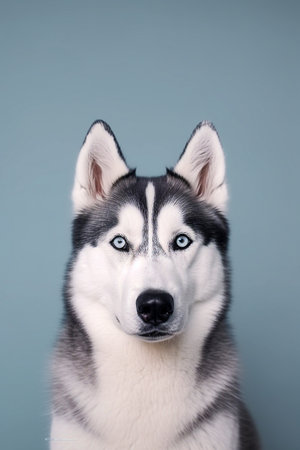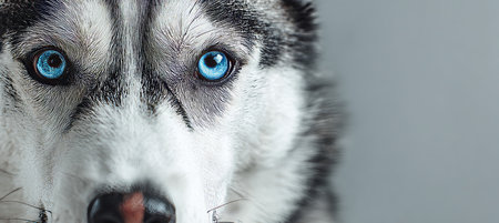 Close Up Portrait of a Siberian Husky Dog with Blue Eyes Against a Simple Gray Background