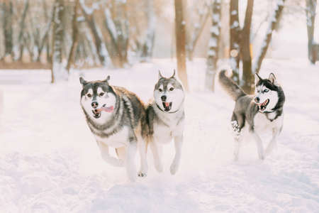Three Funny Happy Siberian Husky Dogs Running Together Outdoor In Snowy Park At Sunny Winter Day. Smiling Dog. Active Dogs Play In Snow. Playful Pet Outdoors At Winter Season