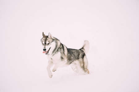 Siberian Husky Dog Walking Outdoor In Snowy Field At Winter Day.