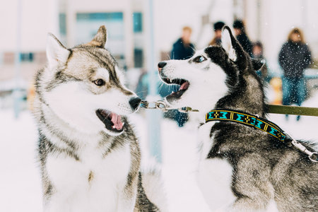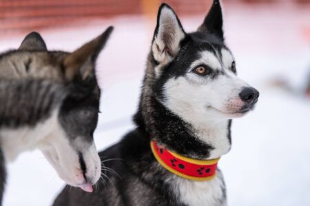 Husky dogs, waiting for sled dog race, winter background. Adult pets before sport competition.