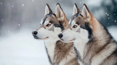Two beautiful sled dogs stand close together in a snowy setting. Their thick fur shines in the cold light, and they are wearing harnesses. A serene winter scene surrounds them.