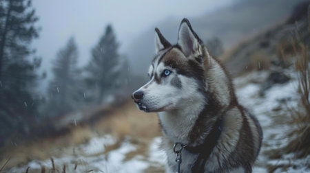 A husky dog with striking blue eyes standing proudly on a snowy mountain trail.