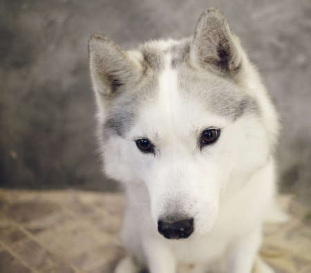 husky pet dog with brown and white fluffy hair and cute face outdoor, closeup