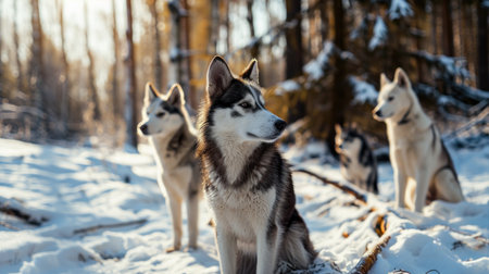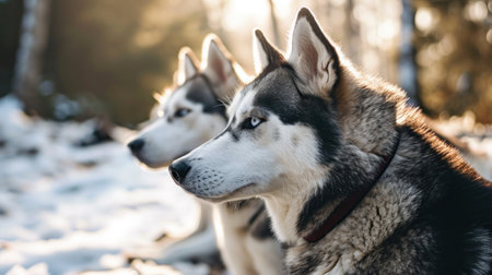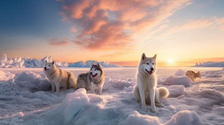 Beautiful huskies resting in the snowy landscape during sunset in a winter wonderland