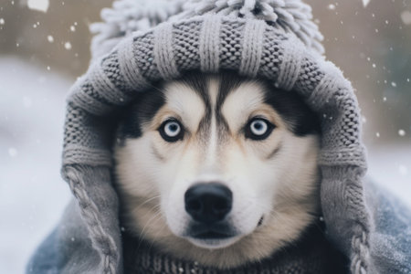 Husky dog portrait, winter snowy background. Funny pet on walking before sled dog training.