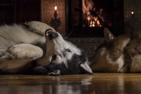 Dogs lie in front warm burning fireplace on winter night. Husky dog lying on his back, holding up their paws and tongue hanging out.