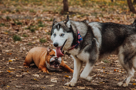a husky dog plays with a bulldog in the park. Two dogs are walking on the background of autumn leaves.
