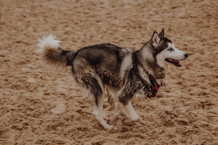 The dog runs in the fresh air. Husky runs on the sand. Big fluffy gray dog near the river.