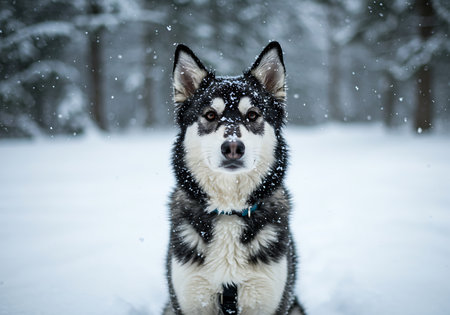 A black and white husky dog, covered in falling snow, sits in a snowy landscape. Generative Ai