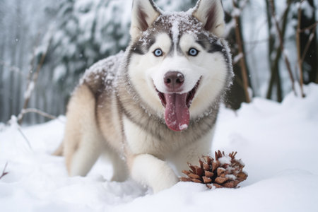 a husky in the snow, playfully biting at its tail, created with generative ai