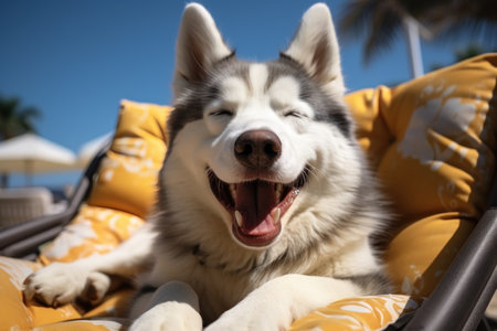 Dog Laid-Back Husky Unwinding on Vacation on the beach. Generative AI