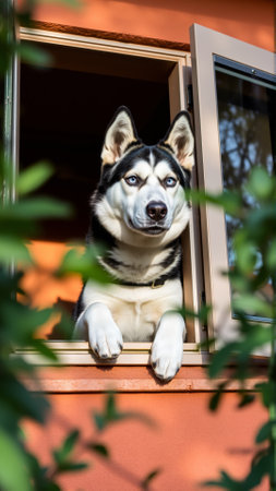 The dog wants to go for a walk. The Siberian Husky is looking at the street from the window of the house. In the yard, there are fresh spring foliage on the trees.