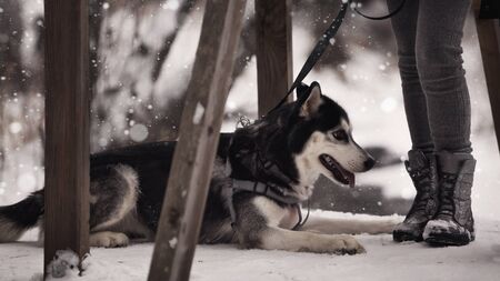 A Siberian Husky dog in the park lying near his owner
