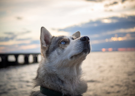 Close-up of a Siberian dog on the beach, gazing intently into the distance with a calm look