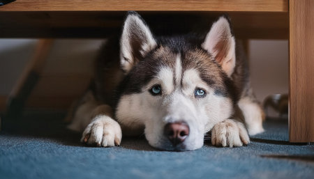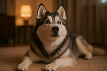 Siberian husky dog eyes looking up while resting on carpet, bathed in warm indoor light, representing domestic comfort and loyalty