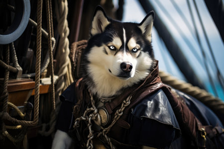 Siberian Husky Dog Dressed As A Pirate At Work. Сoncept Cute Animals At Work, Siberian Huskies In Costumes, Pirate Dress Code At Work, Why Huskies Love To Dress Up.