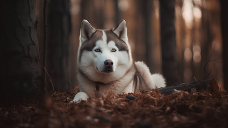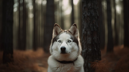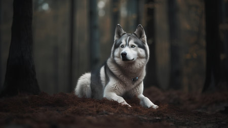 Siberian Husky dog sitting in the forest. 3d rendering