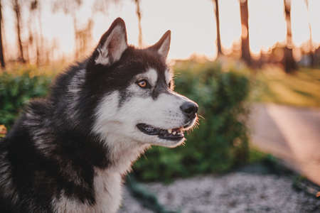 Portrait of a Siberian Husky closeup sun light