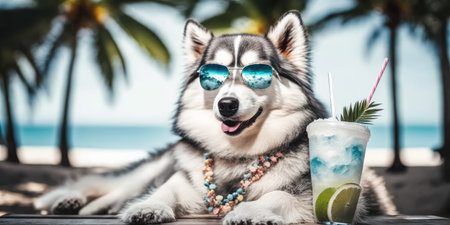 Siberian Husky dog is on summer vacation at seaside resort and relaxing rest on summer beach of Hawaii