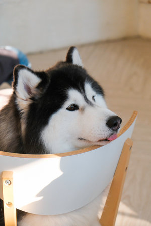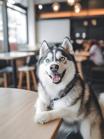 Happy Siberian Husky dog sitting in coffee shop, selective focus