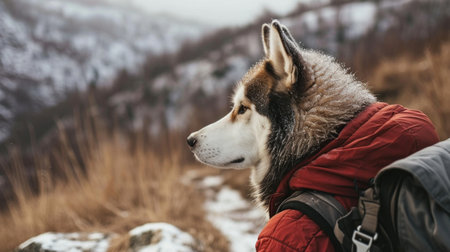 The trekking of Siberian husky dog on the mountain