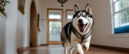 a portrait of a Husky dog in the house