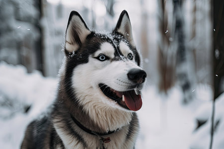 husky dog portrait attractive animal head close up photography with beautiful blue eyes looking side ways in January winter woods blurred background