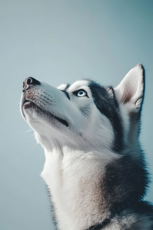 Attentive Siberian Husky portrayed in a serene studio, sky-blue background