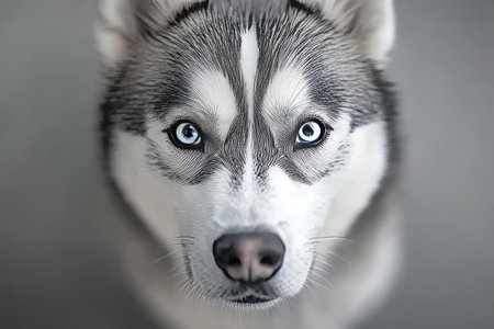 Stunning Siberian Husky with Striking Blue Eyes Posed Elegantly Against a Soft Grey Background