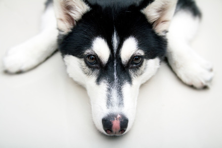 one siberian husky dog looking up to the camera