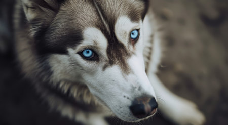 Close-up of a Siberian Husky with piercing blue eyes