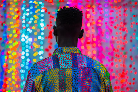 A man stands against a backdrop of radiant graffiti, his silhouette highlighted with bold neon colors. The urban art creates a lively atmosphere rich in creativity and expression.