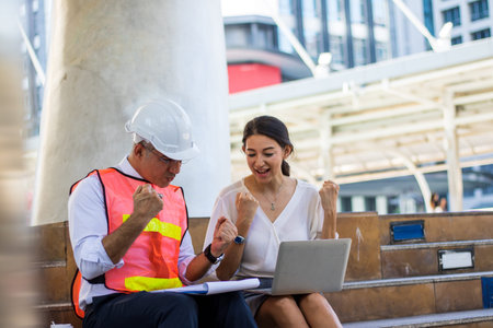 American male engineer and female officer Shouted and lifted his hand, glad after successful work