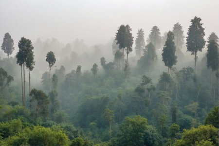 Forest in the misty rainy day